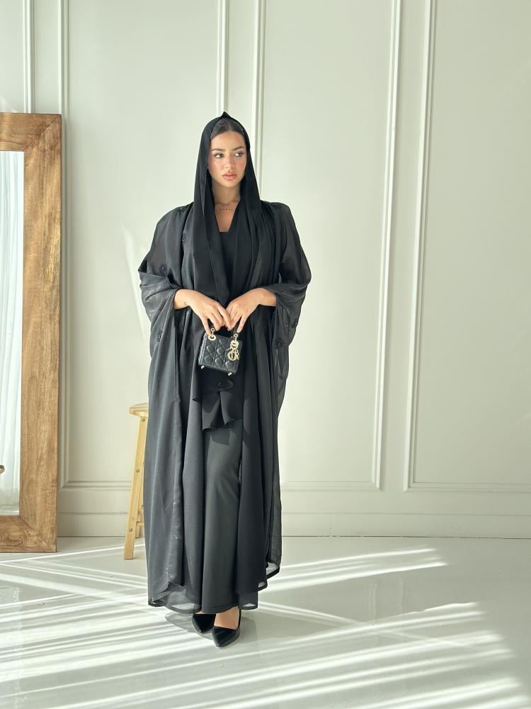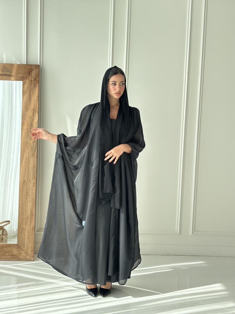 - الطرحة: تأتي مطرزة بالكامل بلون أسود، ومصممة لتكمل العباية بلمسة احترافية.