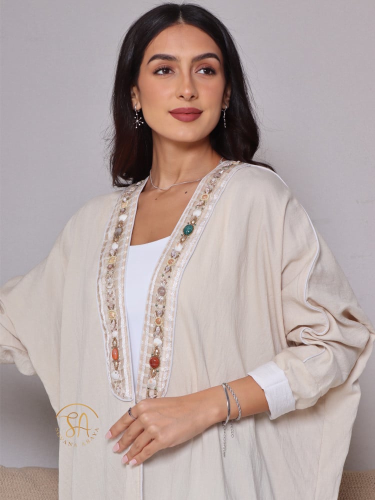 اختاري التميّز مع عباية بحرينيه بتصميم أنيق يعكس التراث بلمسة عصرية. مصنوعة من قماش لينن بحريني بيج ناعم وبارد، ومزينة بكلفة فريدة مرصعة بالصدف الطبيعي تضيف فخامة فريدة ومظهر مميز. القصة نصف بشت تمنحك انسيابية وأناقة لا مثيل لها، من مجموعة عبايات مميزه في Sovana Abaya.