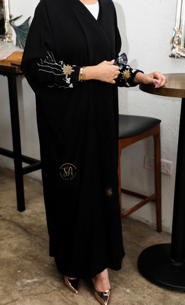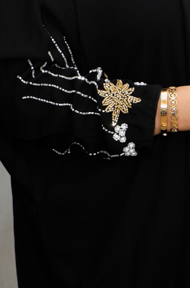 عبايه قماش كريب ملكي بتطريز فريد على الكم بلون الذهبي والفضي نصف مشلح او موديل عايدي